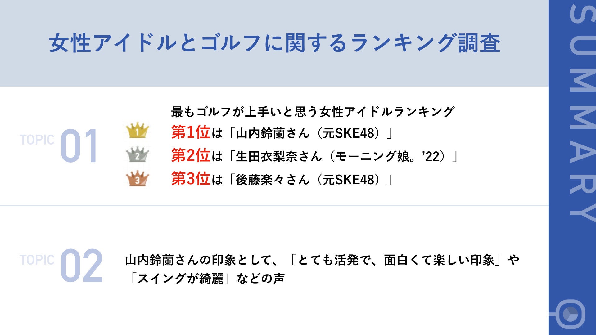 - ゴルフ上手な女性アイドルランキング、第1位「山内鈴蘭さん(元SKE48)」、第2位「生田衣梨奈さん(モーニング娘。’22)」