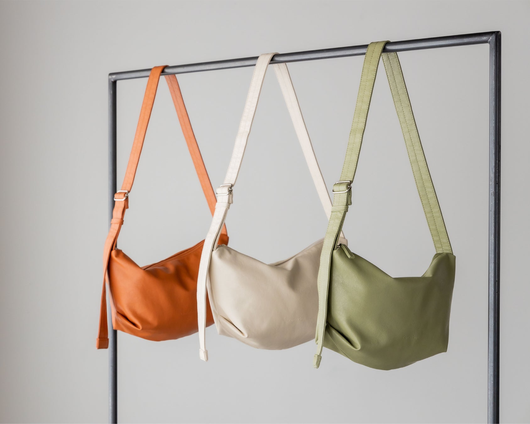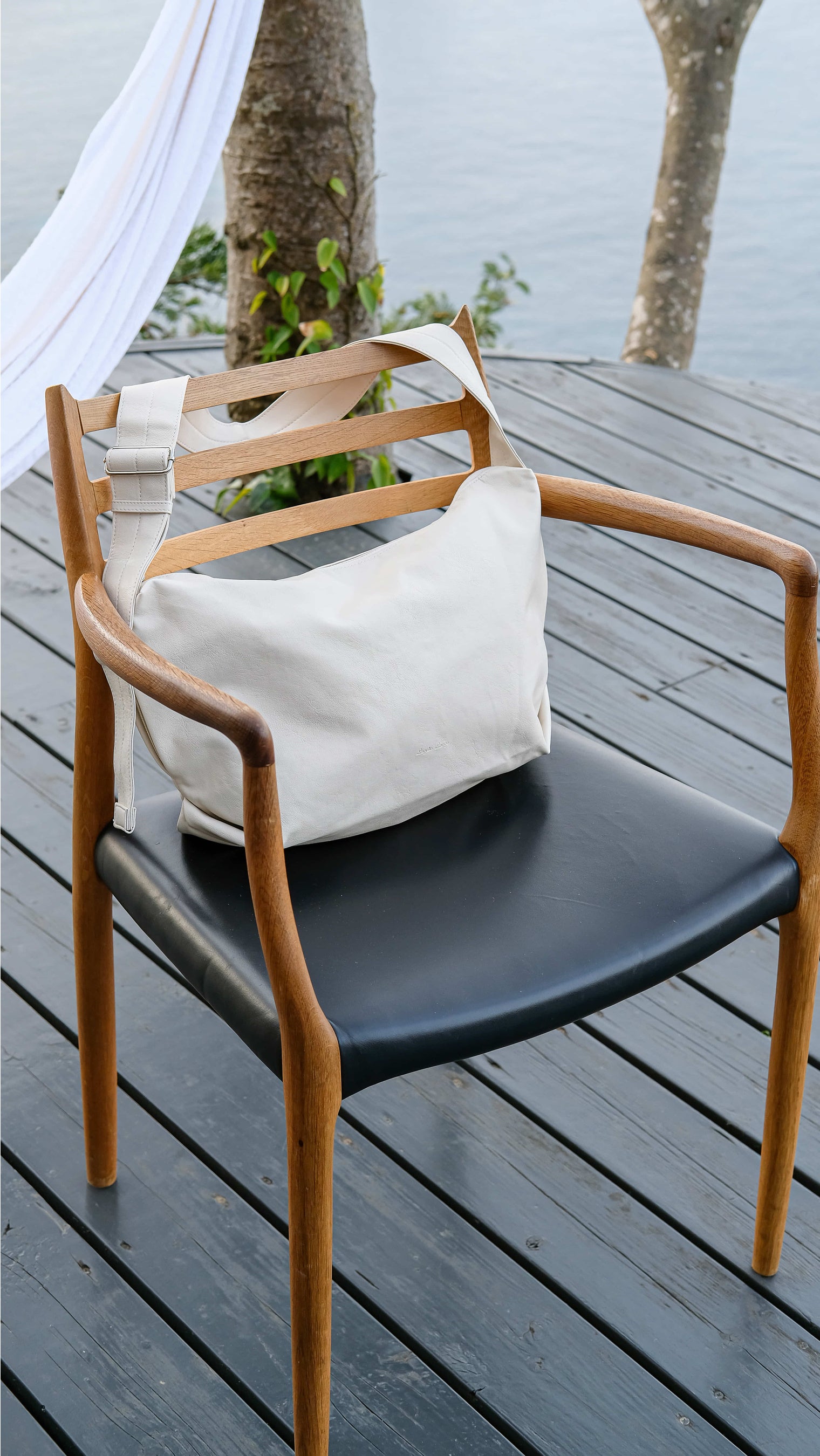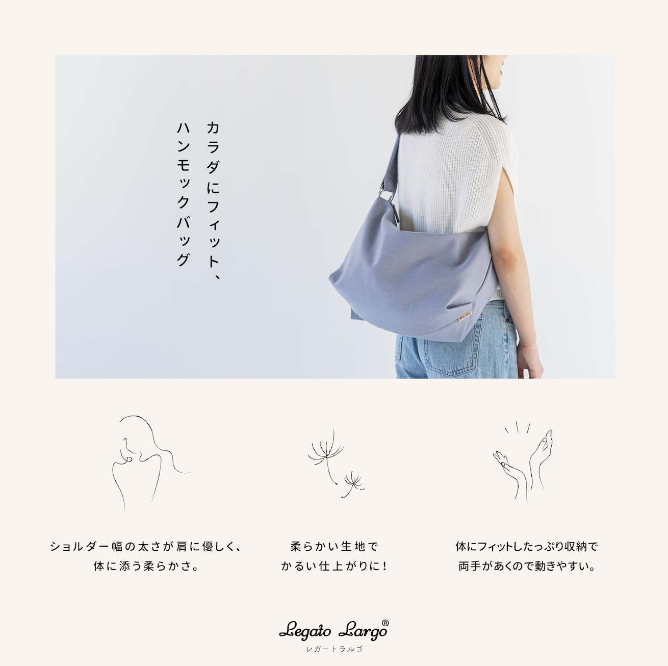 ハンモックのような緩やかなフォルム、体に馴染む生地感、肩に負担を感じにくいショルダーベルトの幅、ワンショルダータイプで両手が空くことでシーンを問わない使いやすさなど、使う人にフィットする機能性が特徴です。