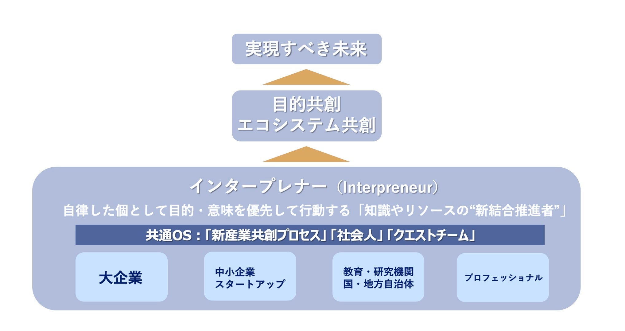 インタープレナーとは、組織や所属の壁を越えて対話を行い、社会起点の目的を特定し、自らが動かせるアセットを動かしながら共創を通じて価値創造を行う、新しいタイプの自律した「社会人」のことです。SUNDREDは個社の製品・サービスだけでは実現できない複雑な社会課題の解決、「実現すべき未来」の共創のためには、インタープレナーが主役となって活躍していくことが重要であると考え、インタープレナー同士による対話からスタートする「新産業共創プロセス」を開発し、数多くの新産業共創プロジェクトに取り組んできました。昨年6月からは経済産業省関東経済産業局と共同で「令和3年度 越境人材を中核とした新産業共創エコシステム構築事業(越境人材プロジェクト)」を開始し、新産業の社会実装を通じてインタープレナー(越境人材)の機能・役割の定義や、インタープレナーが活躍するための社会環境の整備に向けた政策提言の取りまとめを行っています。