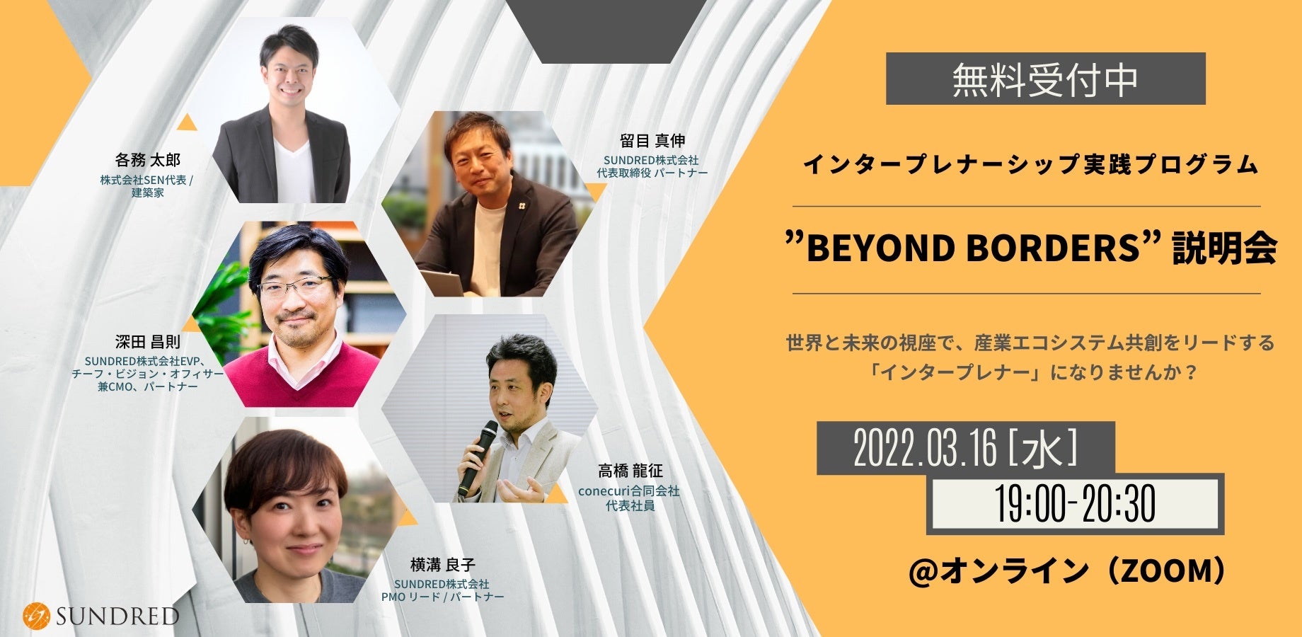 100個の新産業の共創を目指す「新産業アクセラレーター」SUNDRED株式会社(所在地:東京都渋谷区、代表取締役:留目 真伸、以下:SUNDRED)は、2022年3月16日(水)19時より、日本初(※)となるインタープレナーシップ実践プログラム「BEYOND BORDERS」の説明会をオンラインにて開催します。