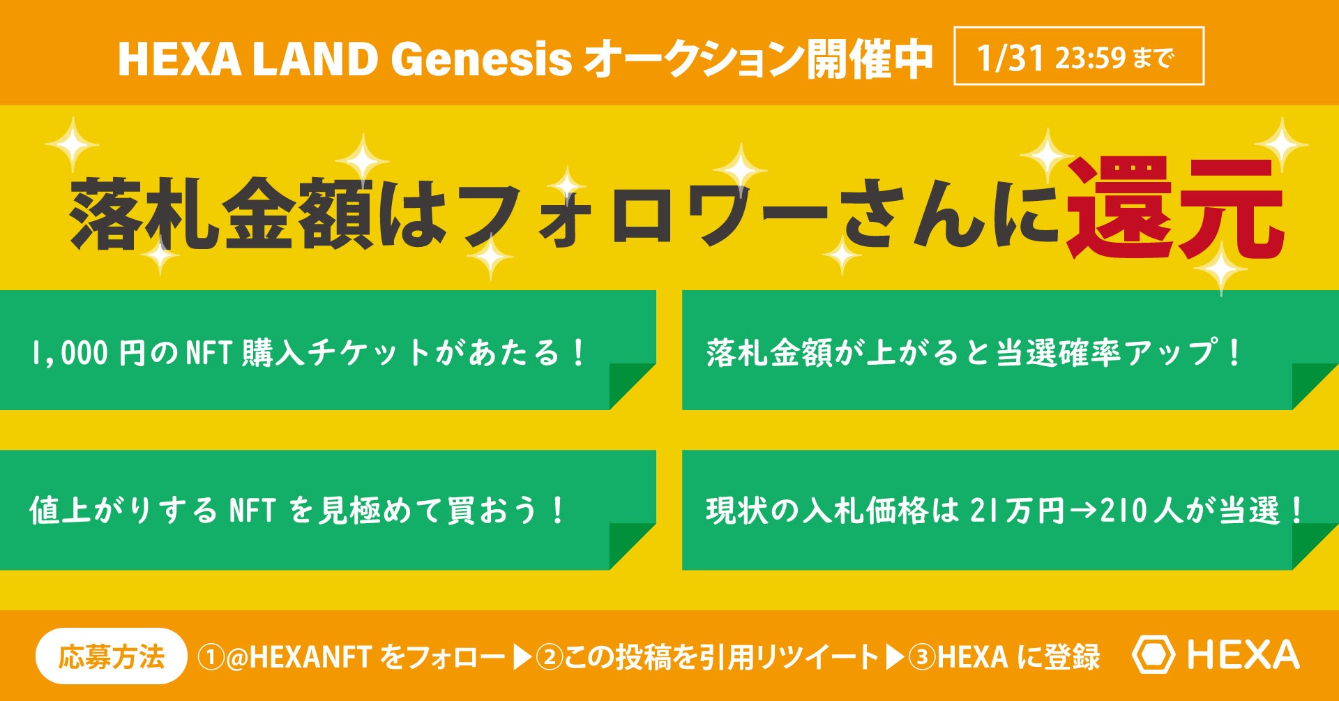 【HEXA LAND Genesis NFTオークション開催中】落札金額はフォロワーさんに還元!1,000円のNFT購入チケットが当たる(21万円なら210人当選)