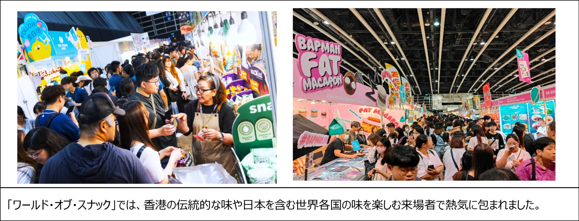 今年、中国の競技大会である第15回「全国運動会」などのイベントが開催されるのに合わせ、「香港スポーツ&レジャーエキスポ」では大会公式マスコットとの写真撮影できる特設エリアが登場しました。競技種目や一般参加型イベントの紹介も行われ、会場は熱気に包まれました。さらに、FIBA 3x3 ワールドツアーの香港初開催や、AI技術を活用したスポーツ体験ブースなど、多様な体験型展示が来場者の関心を集めました。「ワールド・オブ・スナック」には、1,300種類以上の世界各地のスナックが集結し、子どもから大人まで幅広い世代に好評を博しました。