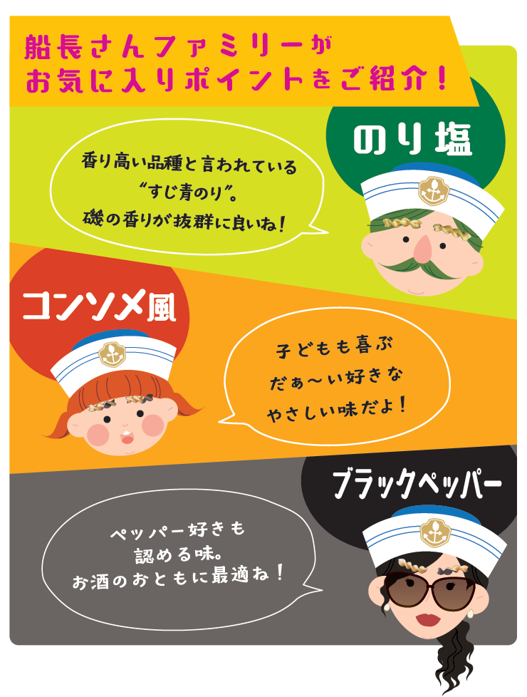 新フレーバーは、真っ黒なサングラスをかけたROCKなママがおすすめする、“刺激的な”ブラックペッパー味。後味にくるブラックペッパーのピリッとした辛さが、やみつきになること間違いなし!お酒のおともにピッタリの一品です。