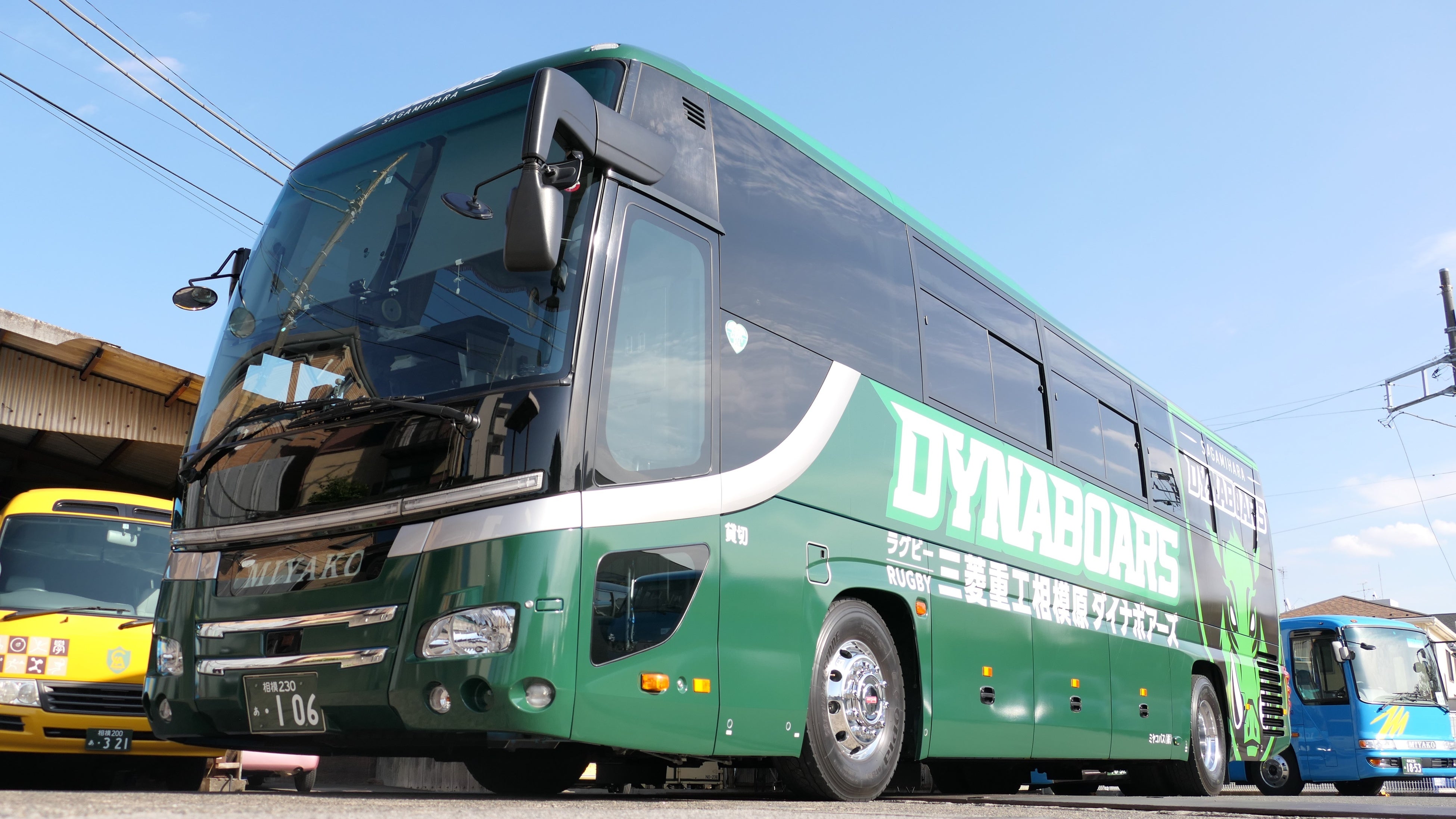 また、ダイナボアーズバスはミヤコバス様によるご手配で一般の皆さまもご利用いただけます。大柄なラグビー選手が遠征で使用する車両はサロンタイプの非常に快適な乗り心地のバスです。ダイナボアーズの選手になった気分にもなれる『ダイナボアーズバス』を、遠足や社員旅行など多用途にご利用いただければ幸いです。