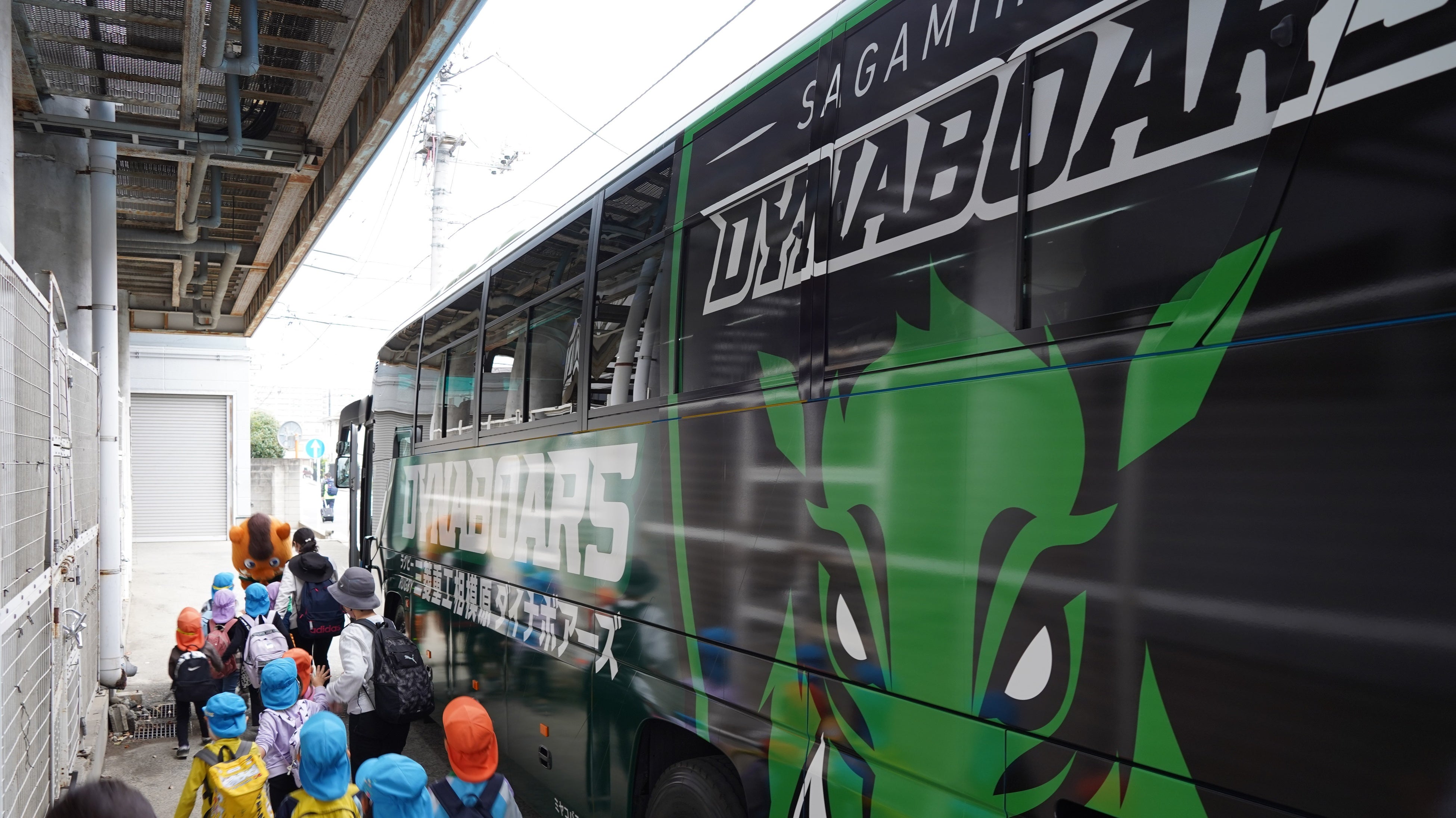 ダイナボアーズバスの初稼働日は11月10日、保育ルームフェリーチェ相模原園(相模原市中央区)の皆さまに、遠足の移動用途でご利用いただきました。ダイナボアーズのチームマスコット・ダイボ君お見送りのもと、相模原市内の同園を同日朝に出発。多摩動物公園までの移動を快適に過ごしていただきました。