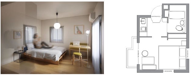 全9室の居室は16.4㎡〜18.4㎡とコンパクトながら、キッチンや3点UBなど水回り、家具がすべて揃っているため手ぶらで入居可能。1ヶ月からの賃貸借契約が可能なため、アクセスのいい場所で仕事に集中したいという方におすすめです。