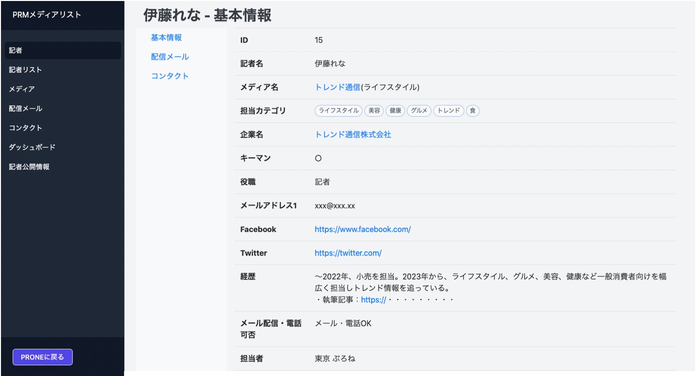 プロネのPRMメディアリストでは、ネット上で公開されている記者の情報(担当媒体・領域・経歴・SNS、過去記事など)をまとめた「記者公開情報」を提供しています。