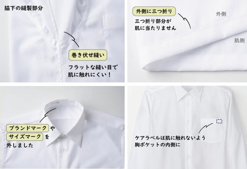 ・首元についていることが多いタグはすべて外し、サイズなどの必要な内容はケアラベル(肌に当たらない胸ポケットの内側に取り付け)に記載しました。