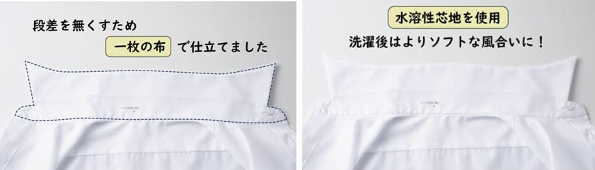 ・襟をひとつのパーツで仕立てることで、段差はもちろん、生地の厚みや縫い目も大幅に減らしました。