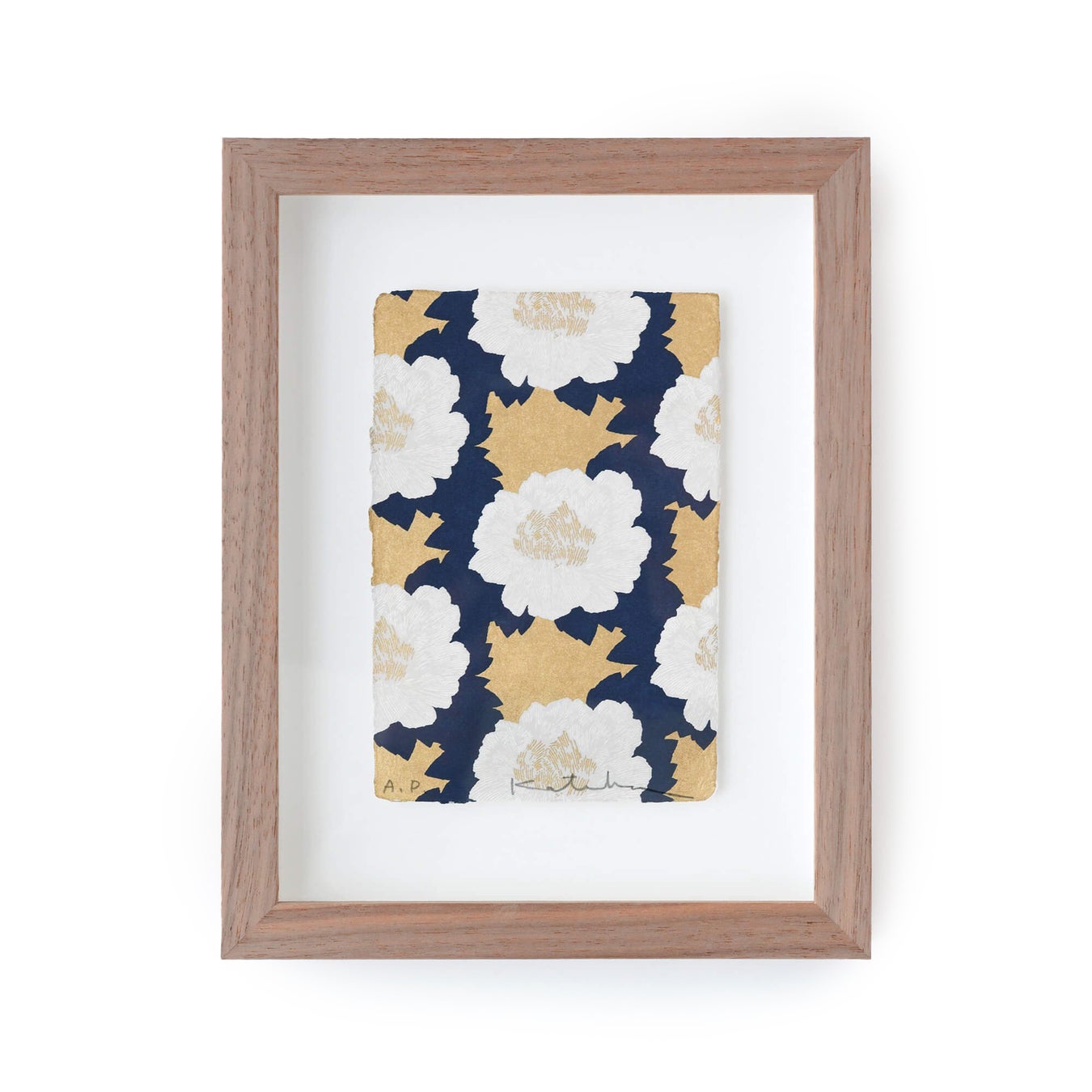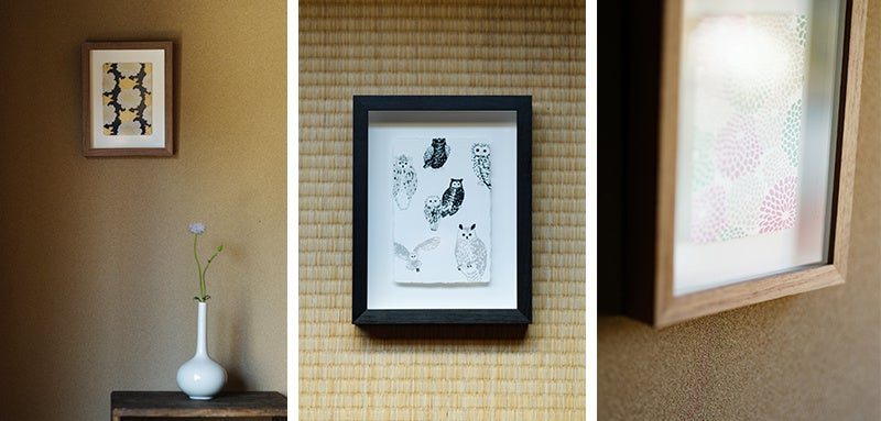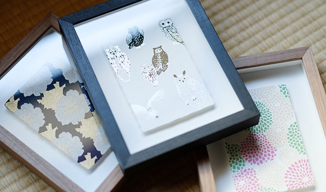素材 │ 版画:和紙 額:ウォールナット材(芍薬・菊づくし) 、ブナ材(ふくろう)