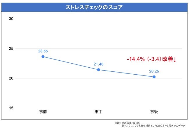 MELONの法人向けプログラム(研修含む)の特徴のひとつに、プログラム前後の効果測定を通じて、効果が可視化できる点が挙げられます。これまでプログラム提供を行ってきた多くのお客様で、ストレス値などの改善効果が確認されており、このサービスをより多くのお客様に広げたいという想いから、今回の全額返金制度をスタートいたします。