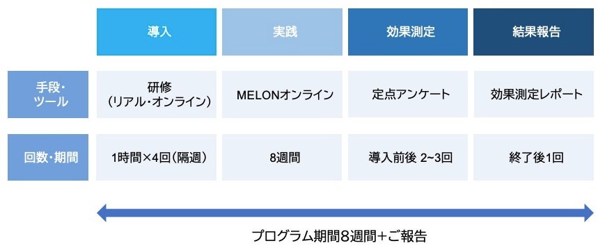 MELONでは、このようなマインドフルネスをスキルとして従業員の方に身につけて頂き、その効果を体感して頂くために、知識を得るための研修と、実践を継続するためのオンラインプログラムを組み合わせた8週間のプログラムを提供しています。