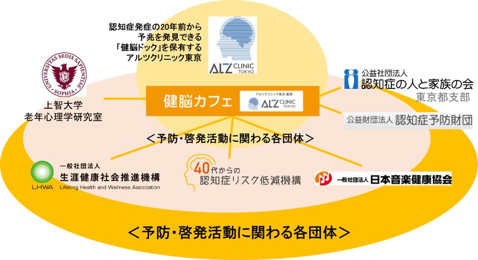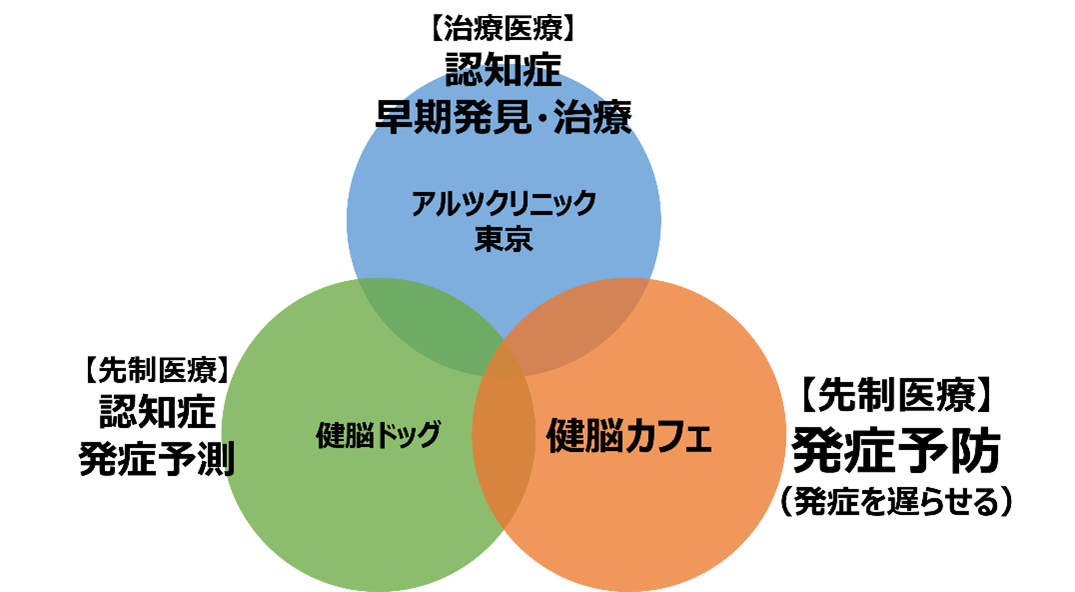 健脳カフェとは…アルツクリニック東京監修のもと認知症の未病段階における予防介入の観点から、産学連携で脳の健康寿命延伸に貢献するための施設です。カフェ内でのプログラムや談話に参加することで未病の段階から予防までを個別プログラムで支援しています。