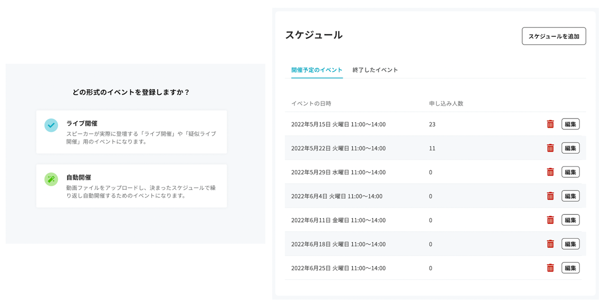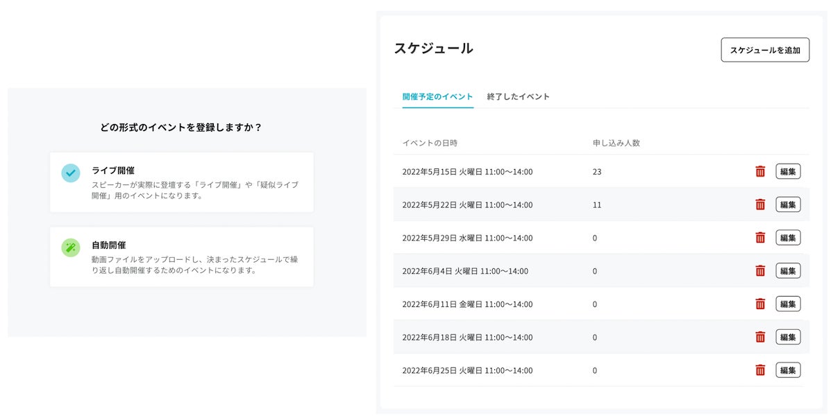 この度実装した「自動ウェビナー機能」によって、アーカイブ動画の再配信をいつでもお好きな時間に、かつ複数日程で予約設定することが可能となります。