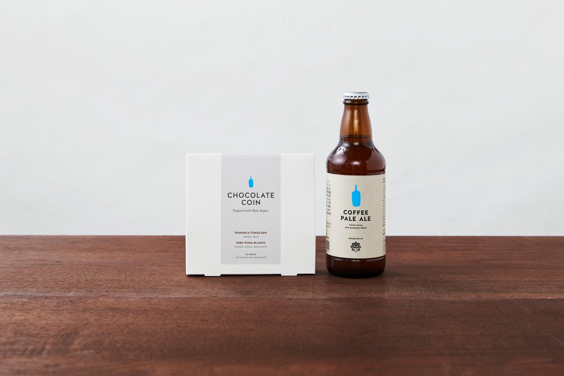 チョコレートコインセット「ドミニカ・コナカド&ペルー・ピウラ・ブランコ」(各10枚・合計20枚)と、三重県 伊勢角屋麦酒と共同開発した「ブルーボトルコーヒー ペールエール」(330 ml・4本)がお楽しみいただけるペアリングセット。ドミニカとペルーのチョコレートが持つフルーティフルーティなテイストが、ペールエールの爽やかさとホップのほろ苦さを引き立てます。ブルーボトルコーヒーで長年人気の定番ブレンド「スリー・アフリカズ」のコーヒー豆を漬け込み味と香りを引き出したペールエールとチョコレートのペアリングを、ぜひお楽しみください。