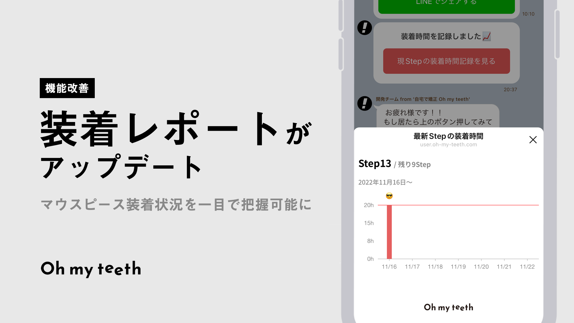 マウスピース矯正においては1日20時間以上マウスピースを装着することが必要ですが、これはなかなか大変なことです。Oh my teethではLINEで装着時間を報告してもらう仕組みをとっており、報告された装着時間をグラフ化することでモチベーションの維持に役立ててもらうことが目的です。