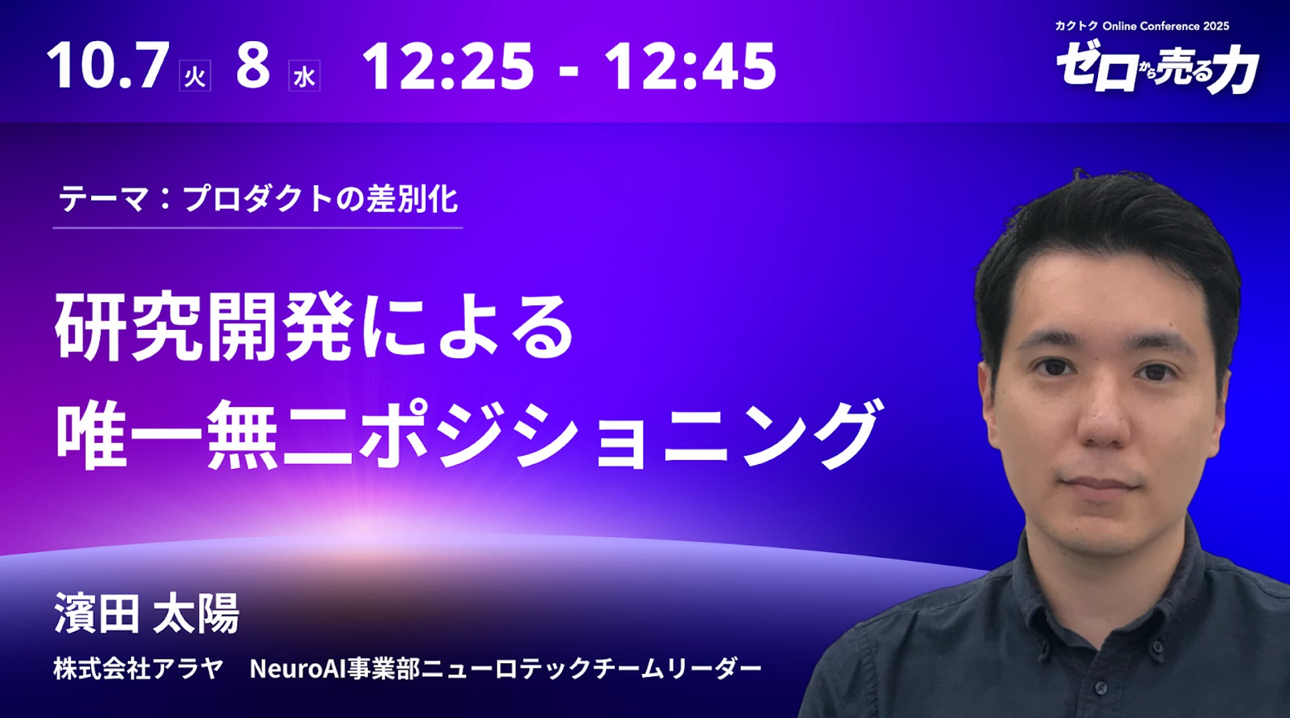株式会社アラヤ(所在地:東京都千代田区、代表取締役:金井良太、以下「アラヤ」)は、2025年10月7,8日に開催されるオンラインカンファレンス「カクトク Online Conference 2025」(テーマ:ゼロから売る力 〜新規事業を伸ばす営業戦略×AI活用×プロダクトの差別化〜)にニューロテックチームリーダー 濱田太陽が登壇します。