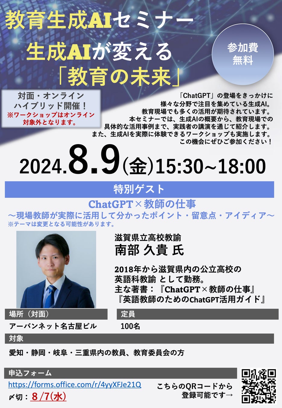 岐阜市教育委員会での学校の生成AIの事例発表のほか、特別ゲストとして 『ChatGPT ✕教師の仕事』著者、滋賀県立高校教諭、南部 久貴氏の基調講演を実施。参加無料。