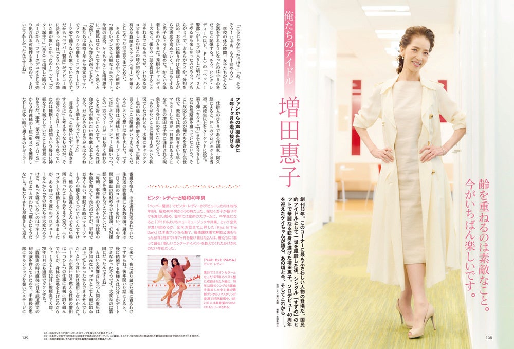 創刊13年。このコーナーに最もふさわしい人物の登場だ。国民的アイドルとして一世を風靡した後、シングル「すずめ」のヒットで華麗なる転身を遂げた増田惠子。ソロデビュー40周年を迎えたケイちゃんが語る、あの頃と今、そしてこれから─。