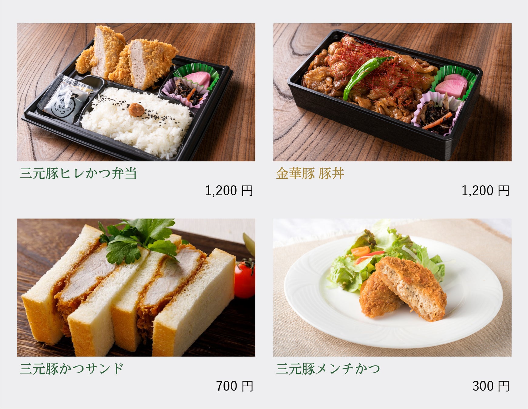 自家用からお土産、贈答用、お弁当まで、幅広いニーズにお応えできるよう展開します。「三元豚ヒレかつ弁当」(1,200円)、 「金華豚豚丼」(1,200円)、 「三元豚かつサンド」(700円)、 「三元豚メンチかつ」など、新幹線でも食べやすいお弁当や食卓の一品に嬉しい惣菜メニューもご用意。いずれも無添加にこだわり、素材のおいしさを最大限引き出したおすすめの逸品です。