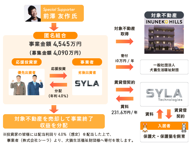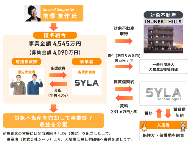 本ファンドは利回りくんの新たな取り組みとして、イヌネコヒルズへの不動産クラウドファンディングにより保護犬・保護猫を救いたいというオーナーを応援するだけでなく、配当の一部を継続的に寄付することができ、犬猫生活福祉財団の殺処分ゼロへの支援を継続的に行うことができます。
