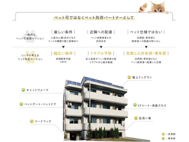 「犬や猫にとっての楽園のような場所にしたい」そのような想いを込めたこの物件は、前澤友作氏プロデュースのもと、マンションに最初から犬猫向け施設を組み込んだ「犬猫共存型マンション」です。