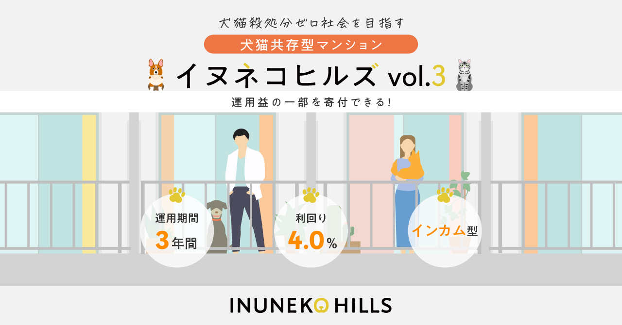 利回りくんでは、犬猫共存型マンション『イヌネコヒルズvol.3』を通じて、犬猫殺処分ゼロ社会を目指す活動を、応援型不動産クラウドファンディングで支援していきます。