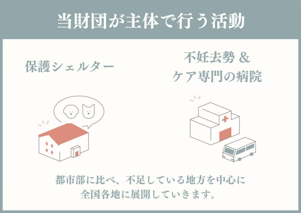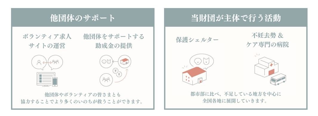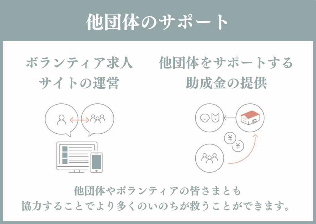そのほかの活動として、他団体の助成金の支給を通して金銭的なサポート、ボランティア求人のマッチングサイト運営を予定しております。