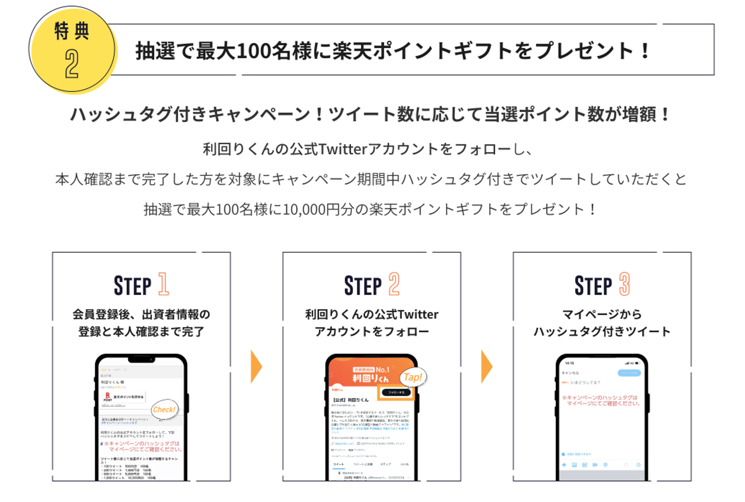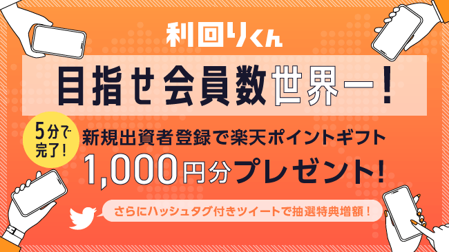 利回りくんでは、国内会員数No.1を達成し、成長を加速させていくため、『目指せ会員数世界一』キャンペーンを開催中です。キャンペーンでは、利回りくんに初めて投資家登録された会員様限定で、楽天ポイントギフトを1,000円分プレゼントいたします。さらに、本人確認が完了された会員様には、抽選で楽天ポイントギフトが当たるキャンペーンを実施します。マイページより指定のハッシュタグ付きでツイートされるとツイート数に応じて、抽選で当たるポイントギフトがランクアップするキャンペーンも同時開催中です。