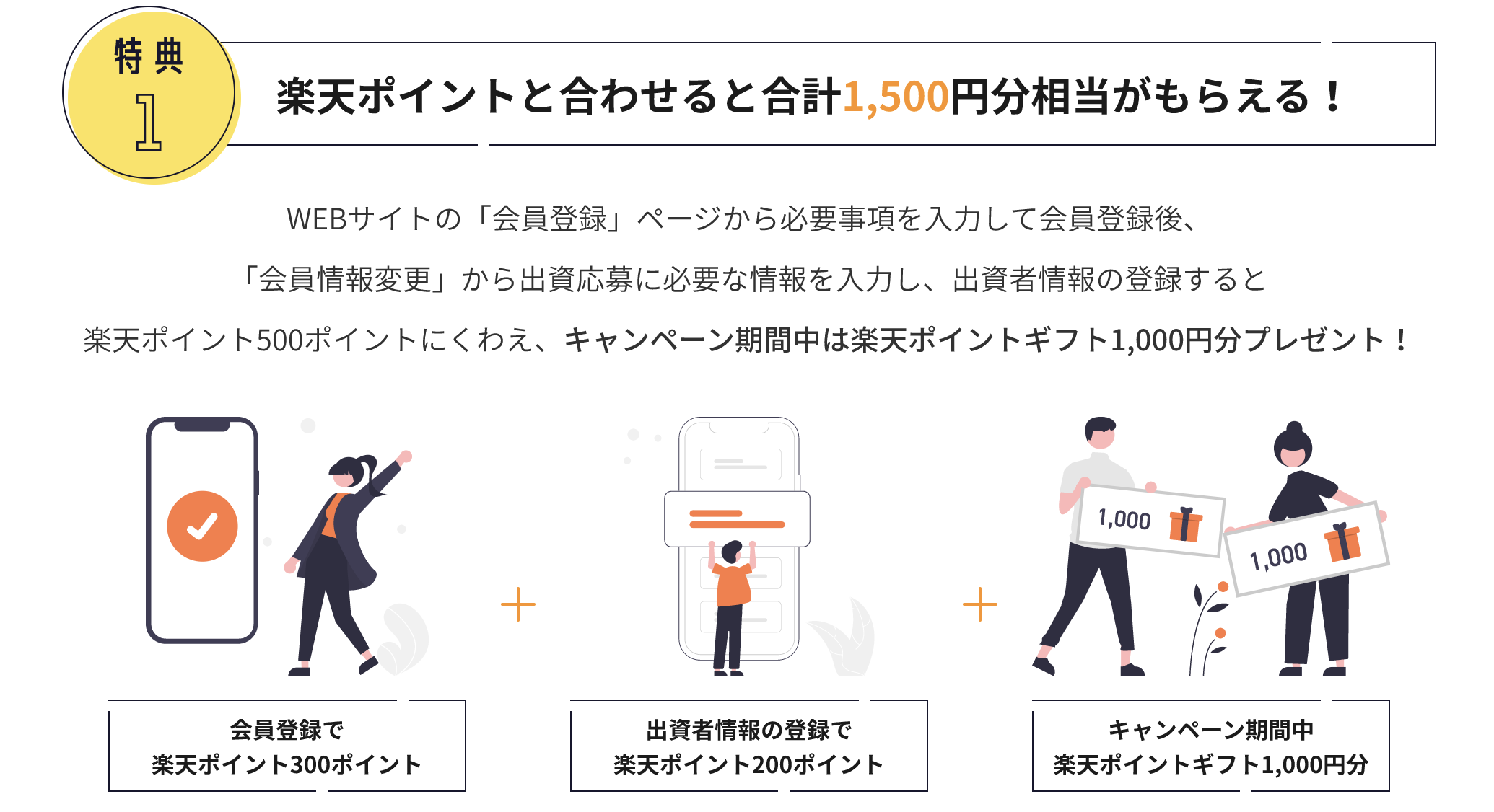 キャンペーンでは、利回りくんに初めて投資家登録された会員様限定で、楽天ポイントギフトを1,000円分プレゼントいたします。