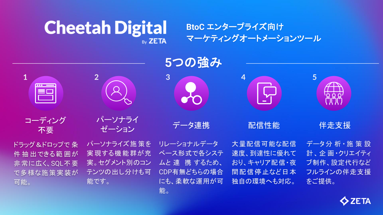 Cheetah Digital by ZETA(旧名称「Marigold Engage+」)は、BtoC企業向けに設計された業界最高クラスのクロスチャネル対応マーケティングオートメーション(MA)ツールです。