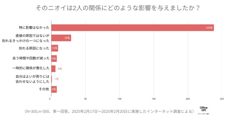 恋人の不快なニオイが2人の関係にどのような影響を与えたかを尋ねたところ、全体の約8割(238名)が「特に影響はなかった」と回答しました。