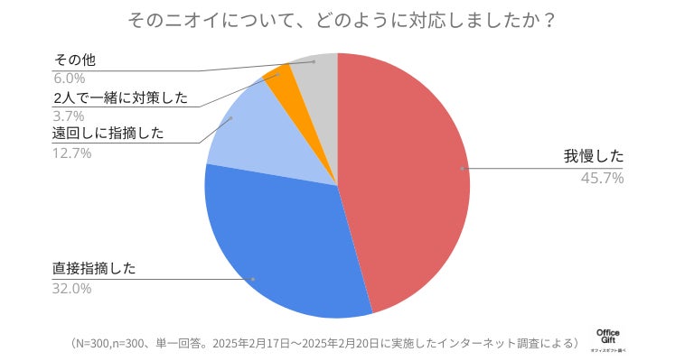 ニオイへの対応は、我慢するか指摘するかで意見が二分されており、人によって異なるアプローチを取っていることが伺えます。