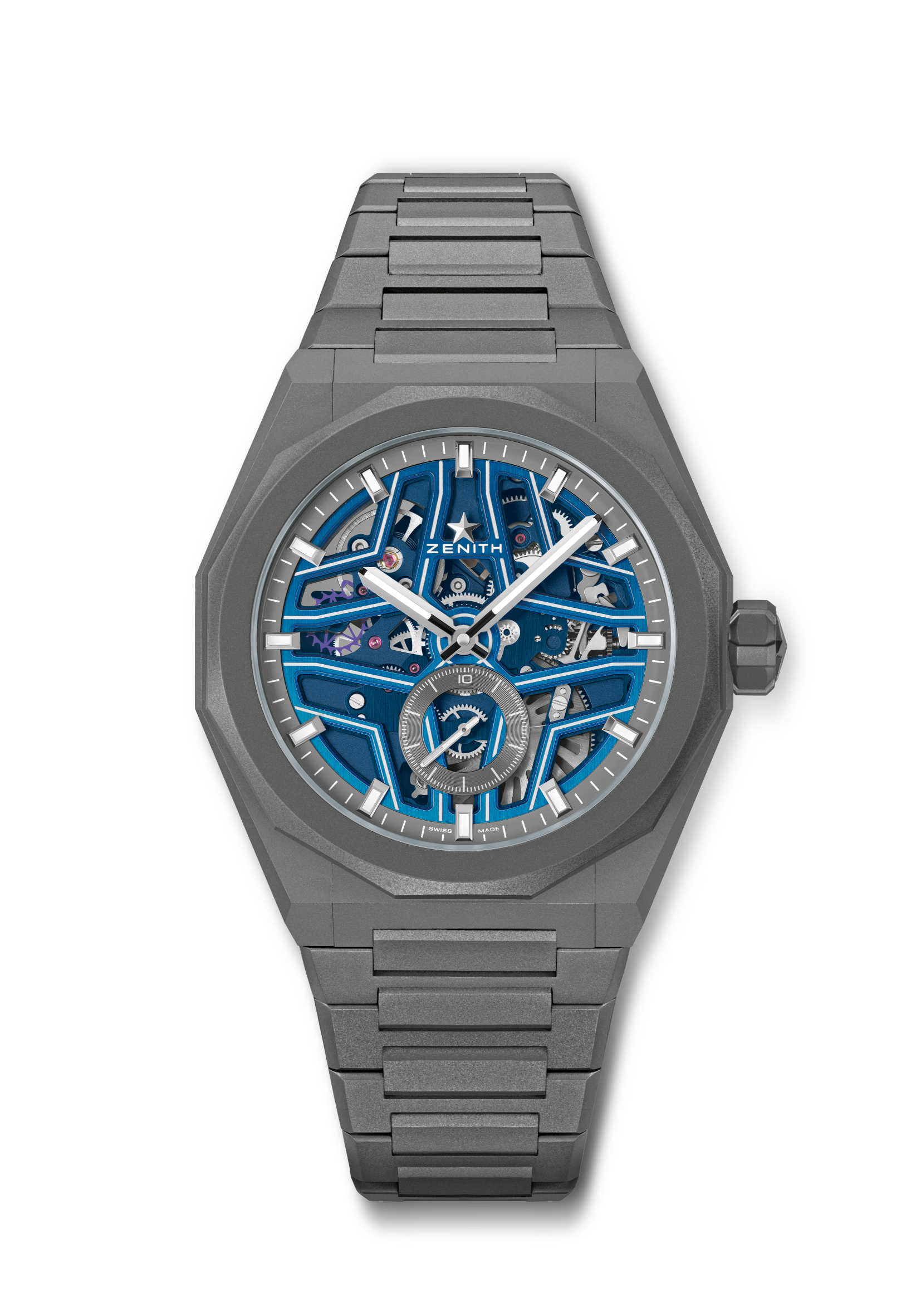 「デファイ スカイライン スケルトン」をベースとし、12角形のベゼルを備える角張った41mmケースの全体と、一体型ブレスレットの素材に初めてマイクロブラスト仕上げのチタンが使用されました。これにより、落ち着いたグレートーンの均一な質感が表現され、光の反射が可能な限り抑えられています。また、10気圧(100m)の防水機能を備えるねじ込み式リューズと、交換可能なストラップシステムを採用したことで、ウォータースポーツをより満喫できるウォッチへと仕上げられました。交換用に付属するブルーのラバーストラップは、工具を使うことなく付け替えが可能です。