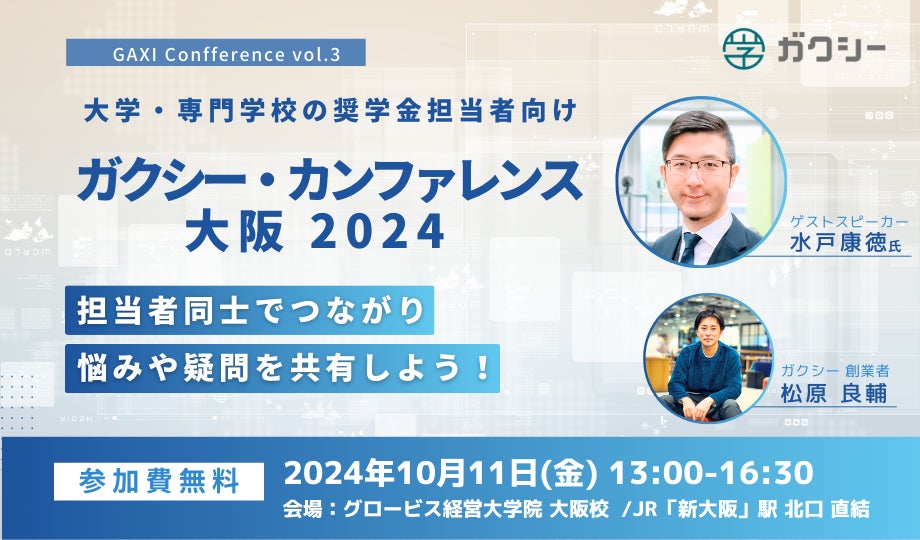 日本最大の奨学金プラットフォーム「ガクシー」(https://gaxi.jp/)および「ガクシーAgent」(https://welcome.gaxi.co.jp)を運営する株式会社ガクシー(本社:東京都港区、代表取締役:松原良輔 以下、当社)は、奨学金や授業料減免業務に携わる大学・専門学校の担当者向けのセミナー『ガクシー カンファレンス大阪 2024』(以下、本イベント)を、グロービス経営大学院 大阪校で10月11日(金)に開催します。本イベントは7月に東京で開催し、大変好評をいただいたことから大阪で追加開催する運びとなりました。(7月の東京カンファレンスについてはこちら)