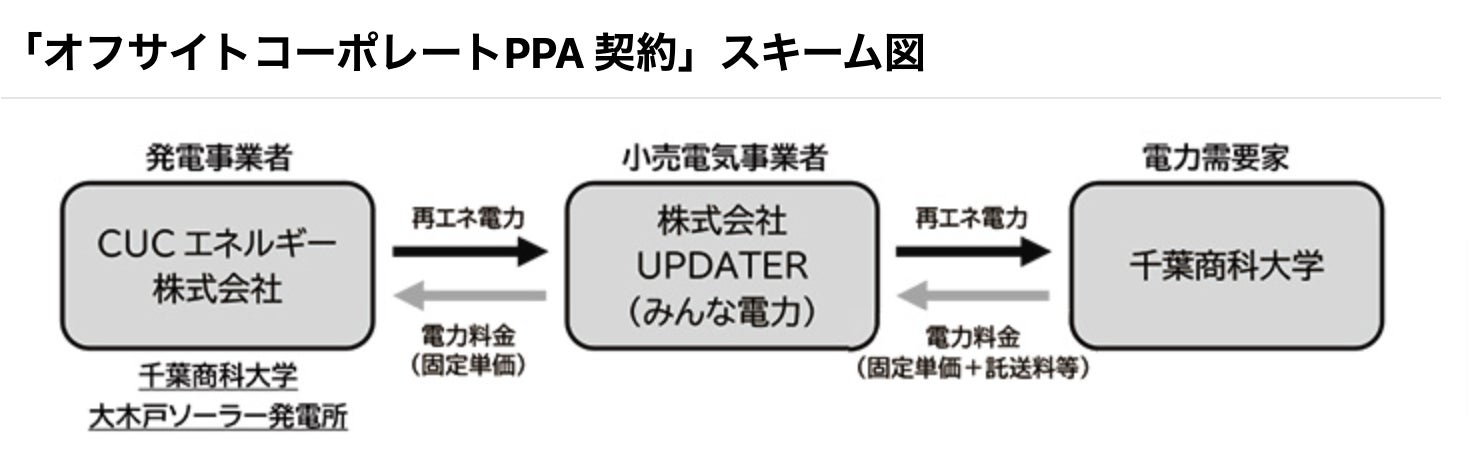 2024年6月、農地を活用した営農型太陽光発電(ソーラーシェアリング)を導入し送電を開始しました。太陽光パネル下部で農作物を育てるだけではなく、学生と地域の方が交流する場として活用を予定しています。発電した電力は千葉商科大学の関連会社であるCUCエネルギー株式会社と株式会社UPDATERが2023年12月に締結したオフサイトコーポレートPPAの契約に基づき、千葉商科大学が20年間固定価格で購入しています。