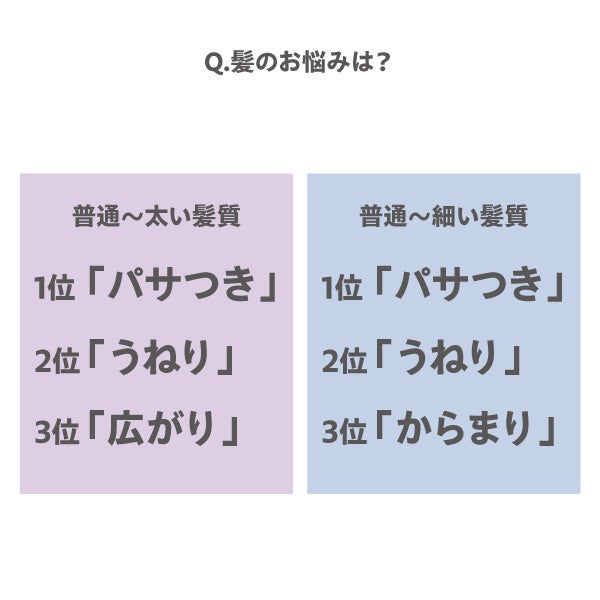 自身の髪質を聞いたアンケートでは、「普通〜太い・硬い髪(以下、太髪)」が48.5%、「普通〜細い・柔らかい髪(以下、細髪)」が46.1%、「わからない」と答えた割合は5.4%で、多数の方が自分の髪質を認識していることがわかりました。髪悩みを聞いたアンケートでは、どちらの髪質も問わず悩みの1位は「パサつき」、2位は「うねり」、3位は太髪「広がり」、細髪「からまり」であることが判明しました。