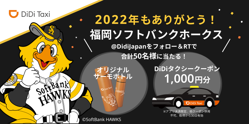 DiDiモビリティジャパン株式会社(本社:東京都港区、代表取締役社長:Stephen Zhu、以下:DiDi)は、福岡ソフトバンクホークスを応援する第二弾のキャンペーンとして、2022年11月16日(水)より、「2022年もありがとう!福岡ソフトバンクホークスキャンペーン」を開催いたします。DiDiの公式Twitterアカウント(@DidiJapan)をフォローし、対象のツイートをリツイートした方を対象に、抽選で50名にオリジナルサーモボトルとタクシークーポン1,000円分をプレゼントします。