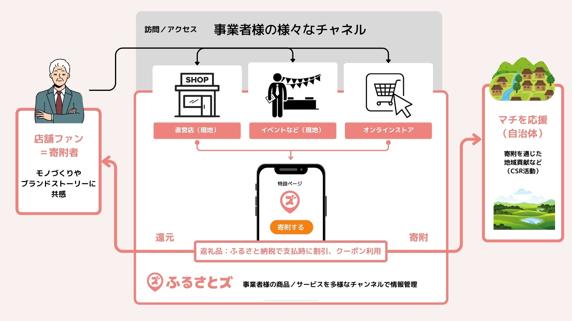 店舗型ふるさと納税(R)ふるさとズは、オンラインでもオフラインでも、好きな店舗で寄附をすることができ、お店のファンがマチを応援できるサービスです。