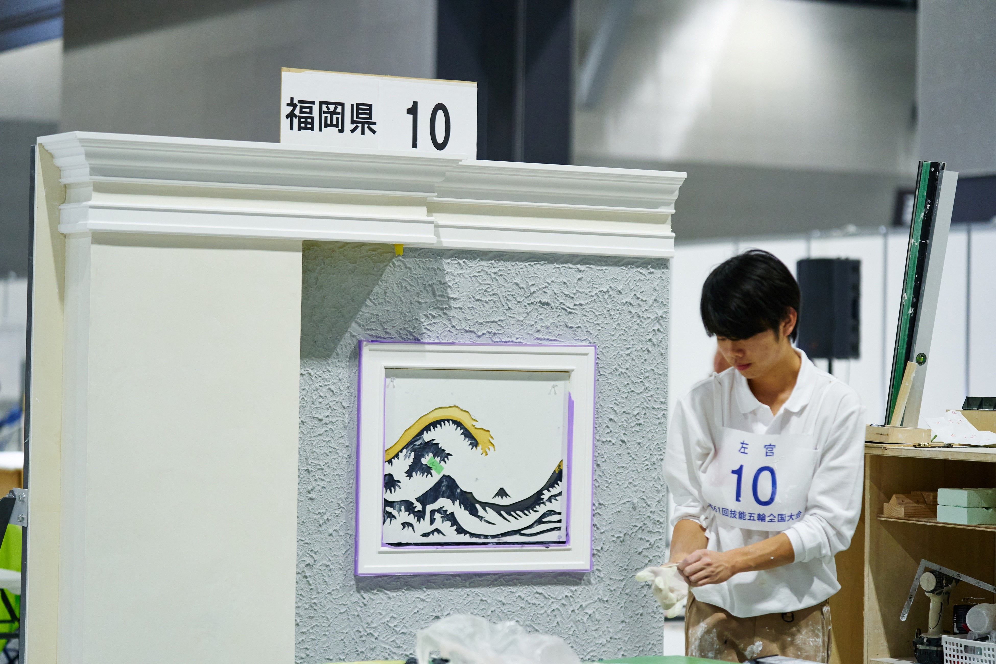 本年は11月17日(金)から11月21日(火)の期間での開催で、41職種、約1,010名の満23歳以下の技能者が都道府県を代表して競技を行いました。愛知県国際展示場で行われた建築大工職種部門の競技は57名、左官職種部門の競技は11名の選手が参加し、専門校からはそれぞれ6名、3名が出場しました。
