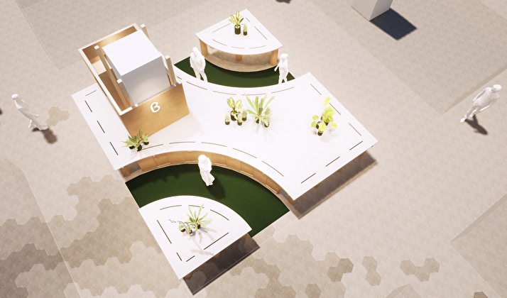 前例のない斬新な形のリテールをおこなうb8taのコンセプトに呼応するべく、またフロア中央に位置したオープン区画という場所の前提を踏まえ、浮かせた大きな水平面を最小限の通路で削り取るという構成で全方向からアクセス可能な新しいコミュニケーションスペースとしてデザインしました。