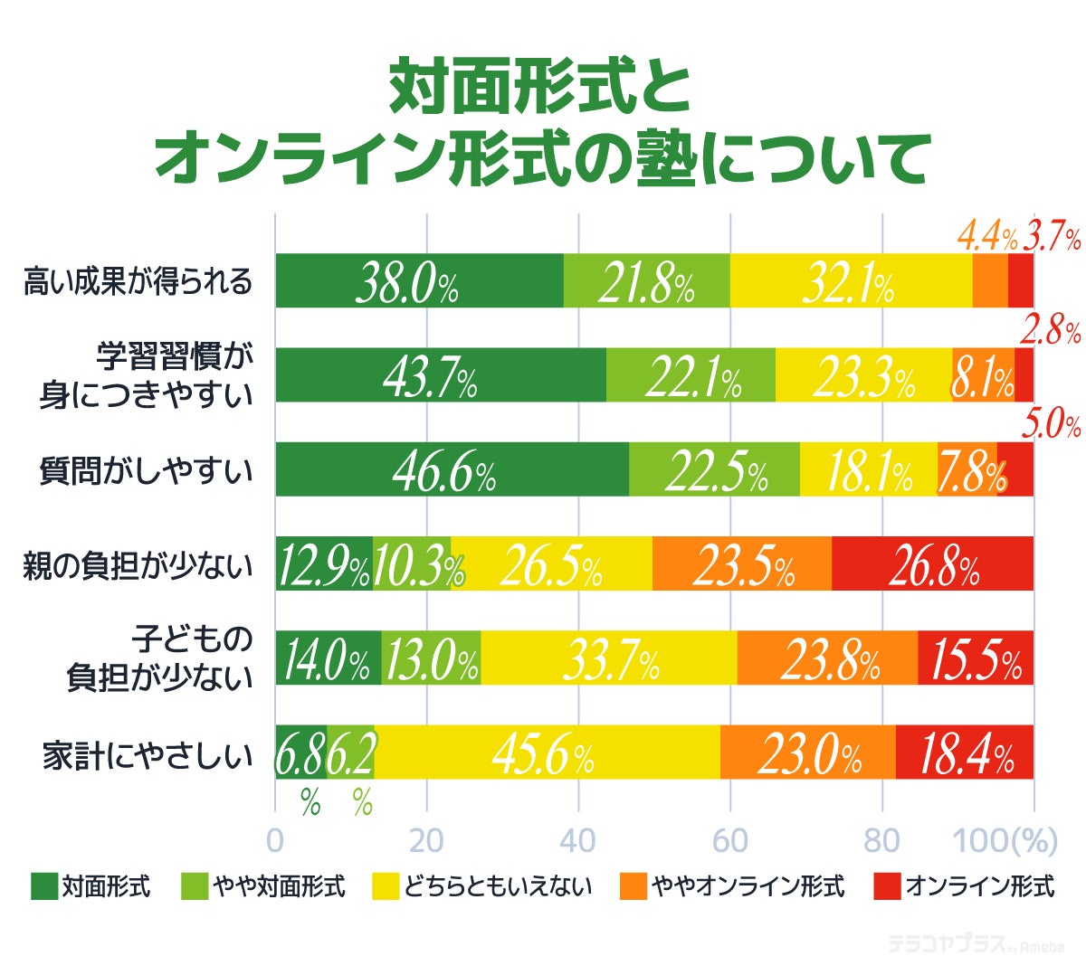 特に対面形式が圧倒的支持を得たのは、質問のしやすさについての項目。対面形式であればその場や授業前後などに聞けることも、オンライン形式ではそのような時間がないため、コミュニケーションが取りづらいと考える保護者が多いのかも知れません。