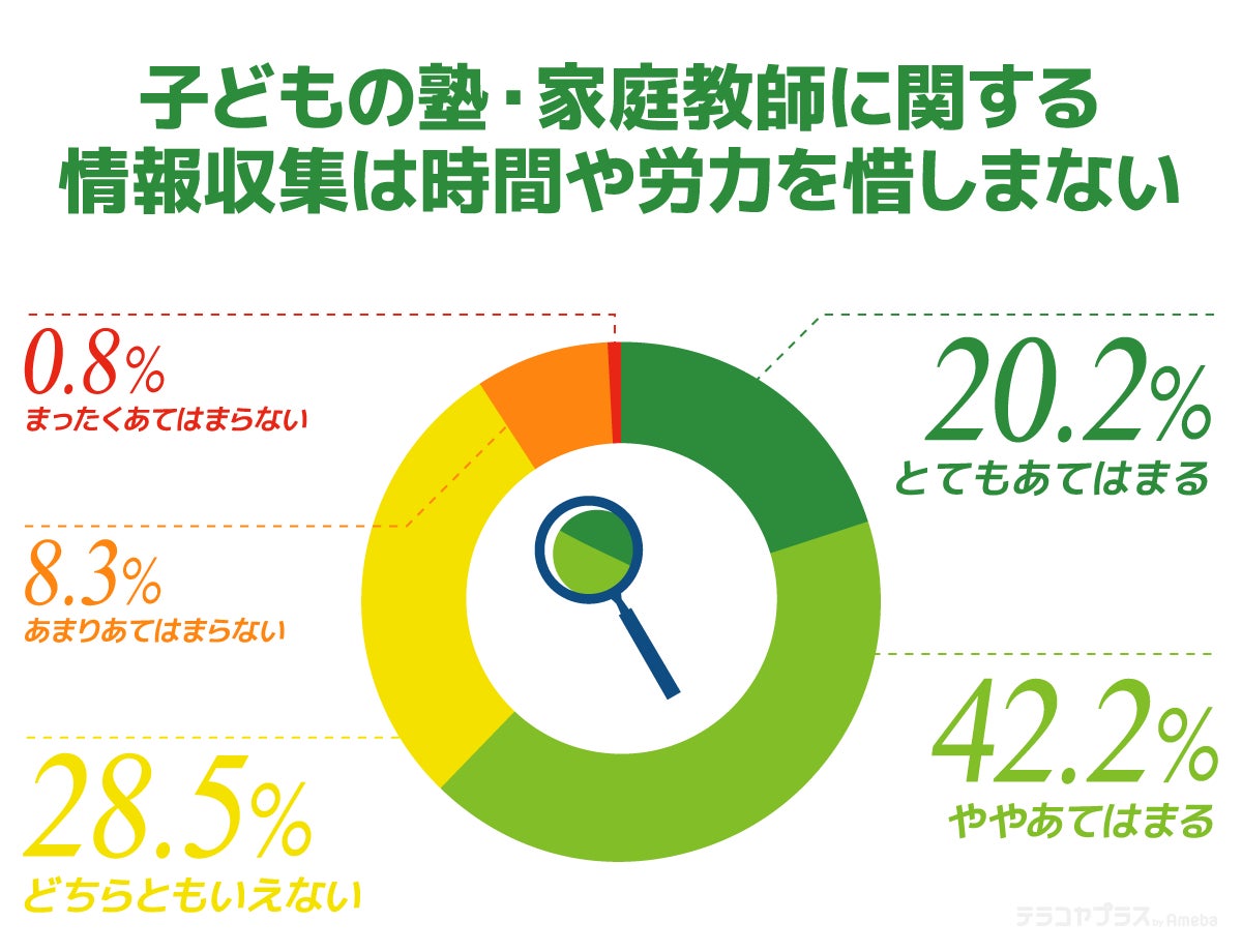 「子どもの塾・家庭教師に関する情報収集は時間や労力を惜しまない」という質問に対して「とてもあてはまる」(20.2%)「ややあてはまる」(42.2%)を選択した保護者は合計6割を超えました。