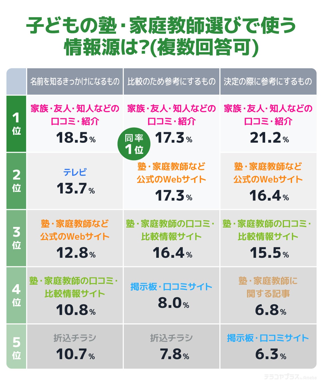 アンケートの結果から、保護者は塾・家庭教師を選ぶ過程からとても力を注いでいることがわかり、情報収集には主に友人・知人などの口コミとインターネット上の口コミが活用されていました。