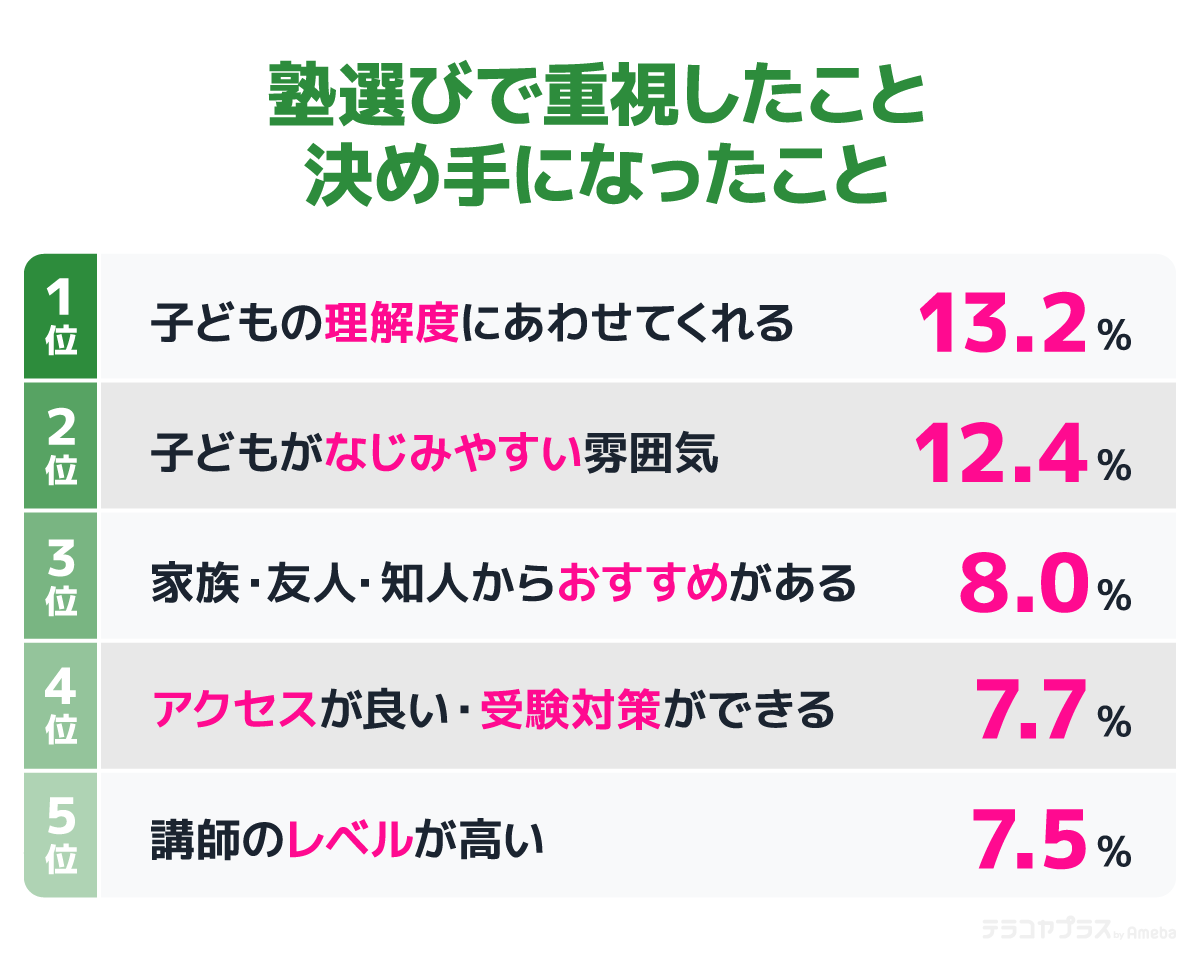 では、どのような点をポイントにして、塾などを選ぶと良いのでしょうか。まずは「塾選びで重視したこと・決め手になったこと」のアンケート結果、上位5つを見ていきます。