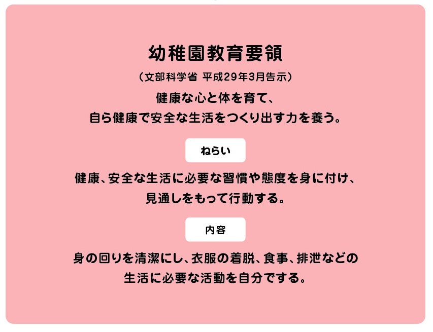 幼児期には、自宅以外では、上手に排便ができない子や、トイレに行きたがらない子も多く存在します。そのため、家庭でも幼稚園・保育園でも絵本を使った、トイレトレーニングが必要とされます。文科省が定めた幼稚園教育要領(平成29年3月告示)でも「健康な心と体を育て、自ら健康で安全な生活をつくり出す力を養う」とあり、そのために「身の回りを清潔にし、衣服の着脱,食事、排泄などの生活に必要な活動を自分でする」とあります。『ぷり』は、楽しみながら、トイレに親しむことができる一冊となっています。