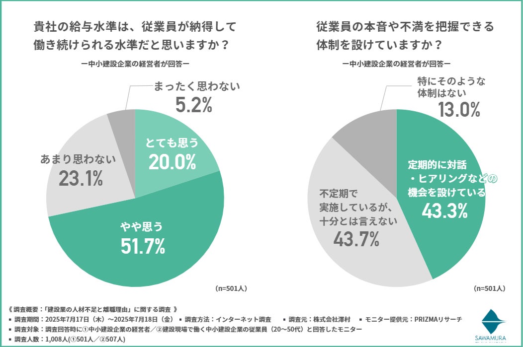 創業74年の総合建設業、株式会社澤村(本社:滋賀県高島市、代表取締役:澤村 幸一郎)は、①中小建設企業の経営者/②建設現場で働く中小建設企業の従業員(20~50代)を対象に「建設業の人材不足と離職理由」に関する調査を行いました。