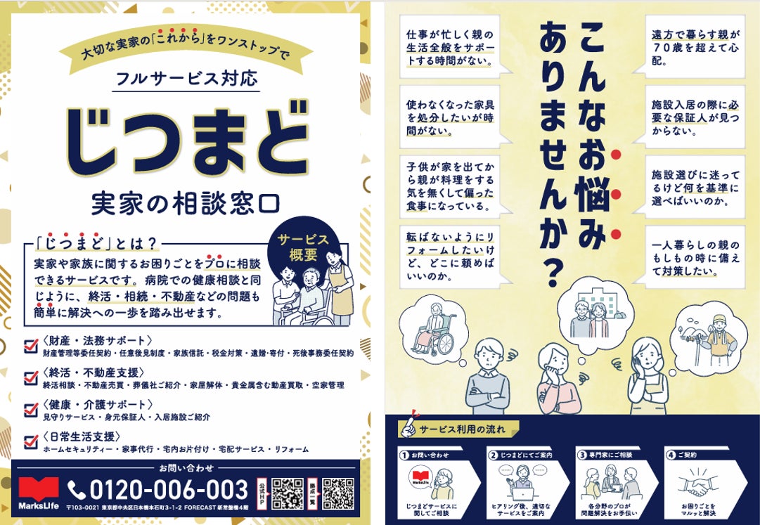 当社では、実家に関するお困りごとをワンストップで解決するサービス「じつまど」 を展開しております。 「実家」にまつわるお悩みごとを丁寧にヒアリングし、それぞれのケースに応じて最適なサービスのご案内・調整・提供を行います。住まいの問題だけでなく、生活・介護・相続・見守り・片付けといった多様なニーズに応じた包括的な相談窓口を目指しております。