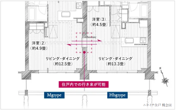計画地のある「五月台」駅前エリアは、1982年の区画整理※2によって戸建を中心とした開発が進みましたが、築30~40年が経過したため、住み替えニーズを意識したプランを検討しました。そして「マンション内での2世帯住宅」をキーワードの一つに掲げ、隣り合う2住戸内で往来できる「ニコイチ住戸」を開発しました。戸境の一部の壁を開口し扉をつけることで、各々のプライバシーに配慮しながらも家族を見守れる新しい二世帯住宅のカタチです。