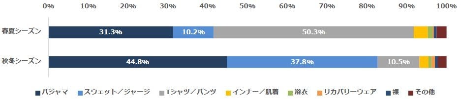 就寝時の服装について質問したところ、春夏シーズンでは、第1位が「Tシャツ/パンツ(50.3%)」、2位が「パジャマ(31.3%)」、3位が「スウェット/ジャージ(10.2%)」という結果になりました。また、秋冬シーズンでは、第1位が「パジャマ(44.8%)」、第2位が「スウェット/ジャージ(37.8%)」、3位が「Tシャツ/パンツ(10.5%)」という結果になりました。